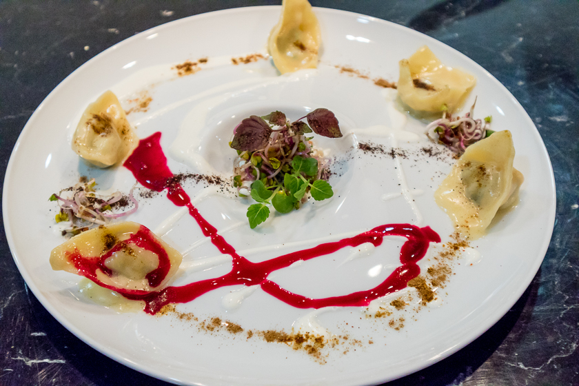 Take the dough and run through pasta roller a few times to get smooth and then increasingly narrow until very thin. Not sure of the exact # setting. Cut into 2″x2″ squares. Place a 3/4″-1″ ball of the filling in the middle, fold in half corner to corner to create a triangle. Pull around the sides of the triangle and overlap to create the “hat” shape. Boil the pasta for a minute or two until done and add to the sauce.