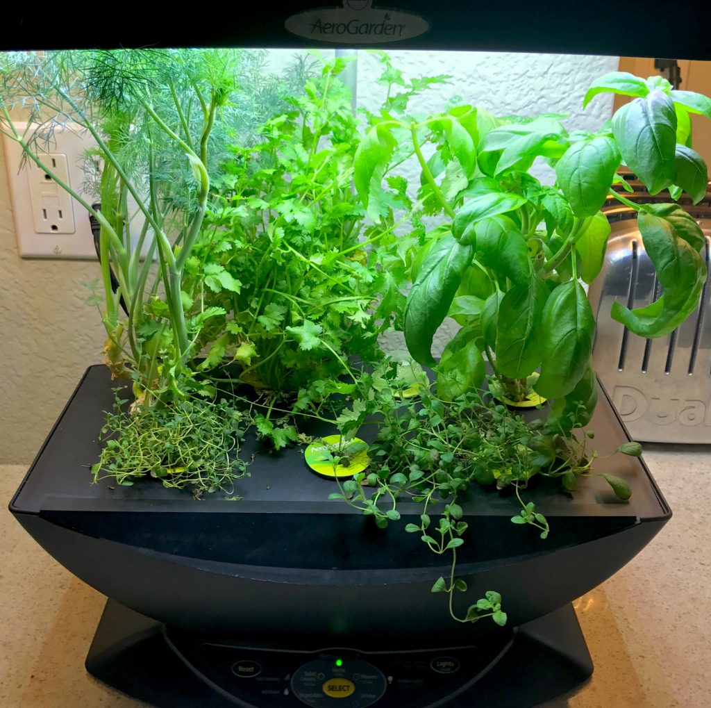 The AeroGarden is a great way to always have a supply of fresh herbs on hand. It’s a hydroponic garden, so it just needs water and nutrients – there is no soil involved. It has bright LED lights that are on an automatic timer to optimize the growth of the plants. You can grow 7 different herbs at a time. They are ready to harvest in a couple of weeks and you just keep trimming and growing for about 6 months. You can also insert a different base for growing seedlings to transplant in the garden (about 52 at a time), which has also been very successful for us. You can grow flowers, small peppers and tomatoes also, but I’ve had the best results with herbs. We’re on our second model (upgraded from CFL to LED lighting) and it’s very reliable. The seed pods you buy from AeroGarden are guaranteed – if they don’t come up, they will send you a new one, but I’ve also just used the bases and planted my own seeds successfully. You can learn more at their site AeroGarden, and you can also buy some of the models, like the AeroGarden Ultra at Amazon.com